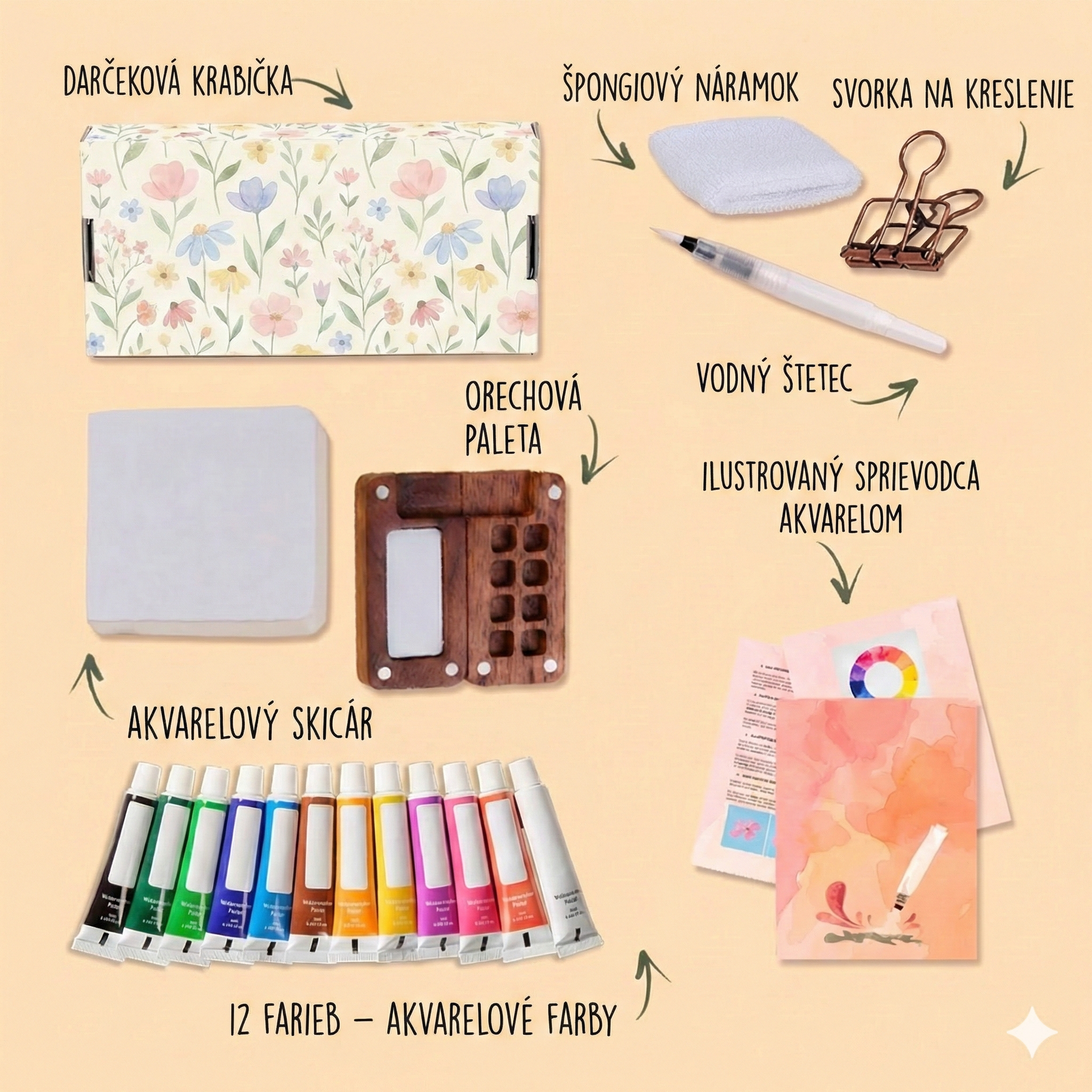 Vo vnútri nájdete 12 náplní žiarivých farieb a pastových pigmentov pre neobmedzené miešanie farieb, zápisník s akvarelový papierom s dokonalou absorpciou a dômyselný štetec.